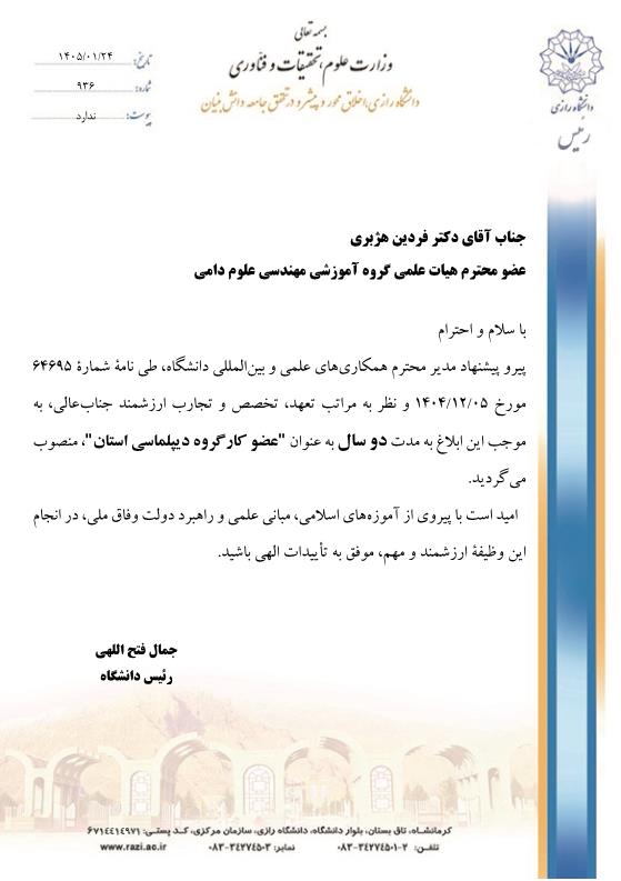 انتصاب دکتر فردین هژبری در کارگروه دیپلماسی استان کرمانشاه - دانشکده علوم و مهندسی کشاورزی